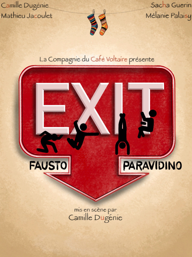 Exit, c’est l’histoire d’une séparation. Une pièce sur l’usure d’un couple où les personnages cherchent désespérément une issue. Une porte de sortie hors d’une vie qui ne correspond plus à leurs attentes. Paradoxalement, l’humour et la complicité émergent au cœur de ce déchirement. C’est la fin d’une relation amoureuse et le début de nouvelles histoires.